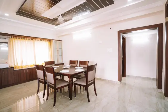 This luxurious 3 BHK AC apartment includes a hall, kitchen, and dining area. It is conveniently located near many restaurants and on the way to Tirumala Temple and near Tiruchanur Ammavari Temple. Ideal for family groups, it features very clean granite flooring, a 43" flat-screen TV with 250+ cable channels, and attached bathrooms with a 24-hour hot water supply.